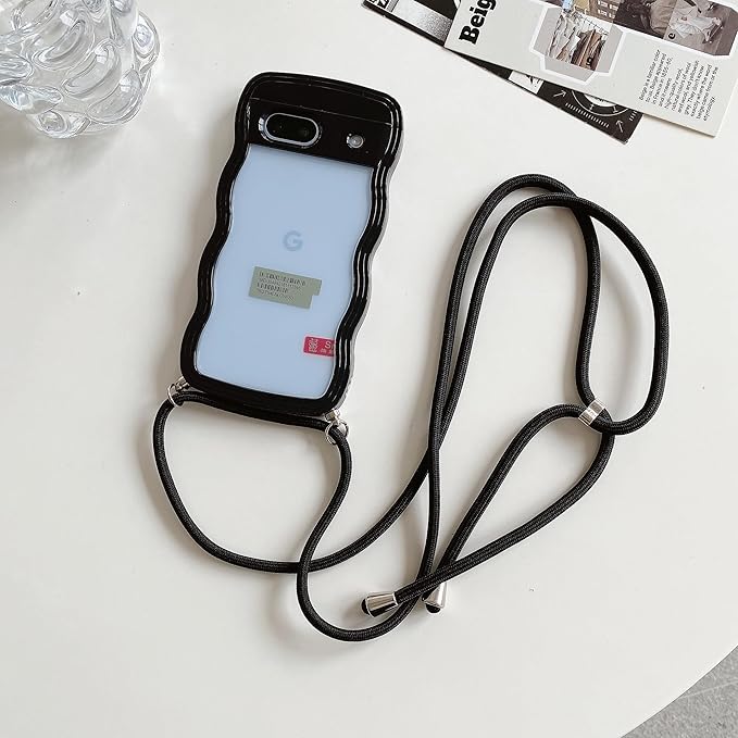 HILEGENER Google Pixel 8A かわいい クリアケース 波状フレームクリア ストラップ ショルダー 耐衝撃 グーグル ピクセル8A 6.1インチカバー 肩掛け 斜めかけ 縄掛けケース【長さ調整可能ブラック縄掛け付き】ウェーブ デザイン スマホカバー 韓国 可愛い 女子向け 人気 落下防止 紐付き 織りスト ネックストラップ ショルダー (Pixel 8A-ブラック)