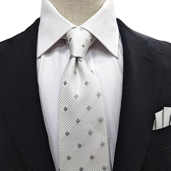 結婚式や披露宴、パーティーなどお祝いの席に必要な慶事用ネクタイ。 白、シルバーを基調としたシルク100%のネクタイ。 撥水・撥油・防汚のテフロン加工の生地を使用しており、より安心して着用できます。 レギュラー幅 大剣8.5cm 全長145cm
