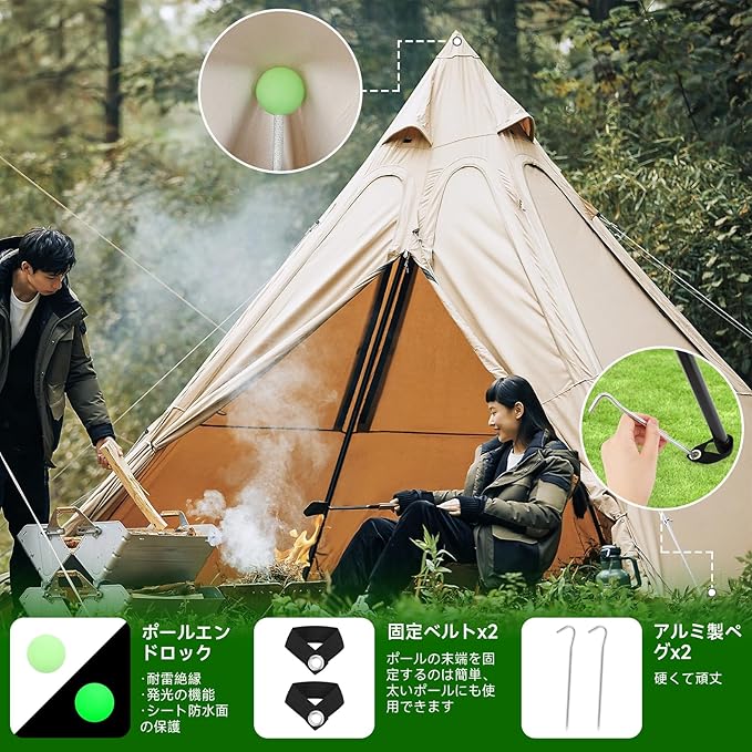 【エンドキャップ付】二股の先はキャップが用意され、様々なテント・タープへ対応出来、色んな用途に使えます。①風にあおられてもガイロープやグロメットがピンから抜ける心配がない②夜光機能③雨水がタープの上に溜まりにくい④タープを傷つける心配がありません。また、真ん中穴の部分にはライトなどのキャンプギアを吊り下げることができます