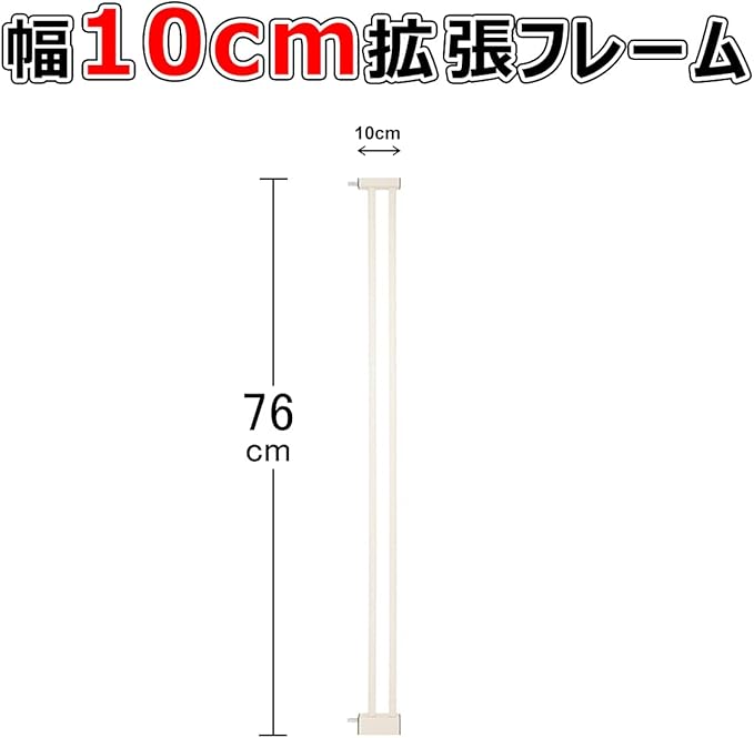 ペットゲートの拡張フレーム幅は10 cmです。ご購入する前に、取り付け予定の幅を測ってからご注文ください。