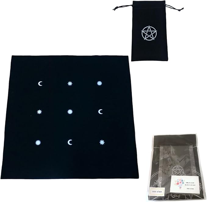 【商品仕様】商品内容:タロットクロス1枚、タロットバッグ1個。カラー:ブラック。サイズ:タロットクロス50cm 50cm。タロットバッグ長さ18cm、幅11.5cm。合計重量:60g。モニターなど環境により画像と若干見え方が違う場合がございます。