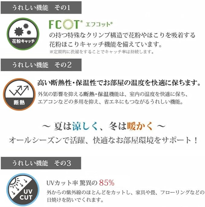 帝人の機能糸「涼しや」&「エフコット」を編み込んだ光と風を通す多機能なレース障子です。夏は遮熱効果、冬は保温効果があります。また花粉キャッチ機能で外から室内への花粉やホコリの進入を抑えます。レース生地ですので、通気性や採光性に優れており、破れにくい素材なので障子紙に比べると長持ちします。取付方法は、桟のサイズに合わせて、カットしてお使いください。詳細な取扱説明書(レース障子の貼り方)が付いていますので、作業が不慣れな初心者の方でも安心。紙と違って破れないので、ゆがんだりたるんだりしたら貼り直しが出来ます。細幅の両面テープが2巻付いてます。水のり等を使わないので準備も簡単で汚れません。 ※障子レース生地を貼る際、生地の表と裏を間違わない様にしてください。(※光沢がある面が屋外側になります。)梱包状態のたたみシワが気になる場合はアイロンを掛けてから貼ってください。