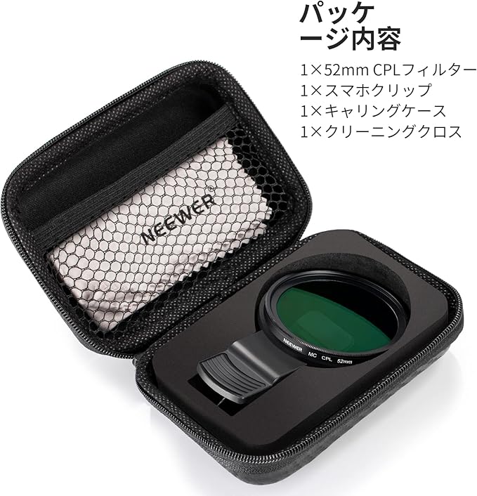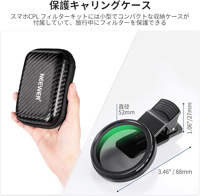 NEEWER 52mm CPLフィルター スマホ用 円偏光レンズフィルター クリップオン式 スマホクリップ/収納ケース/クリーニングクロス付き 偏光フィルター コンパチブル iPhone/Galaxy/Android/DSLRカメラ FL-26