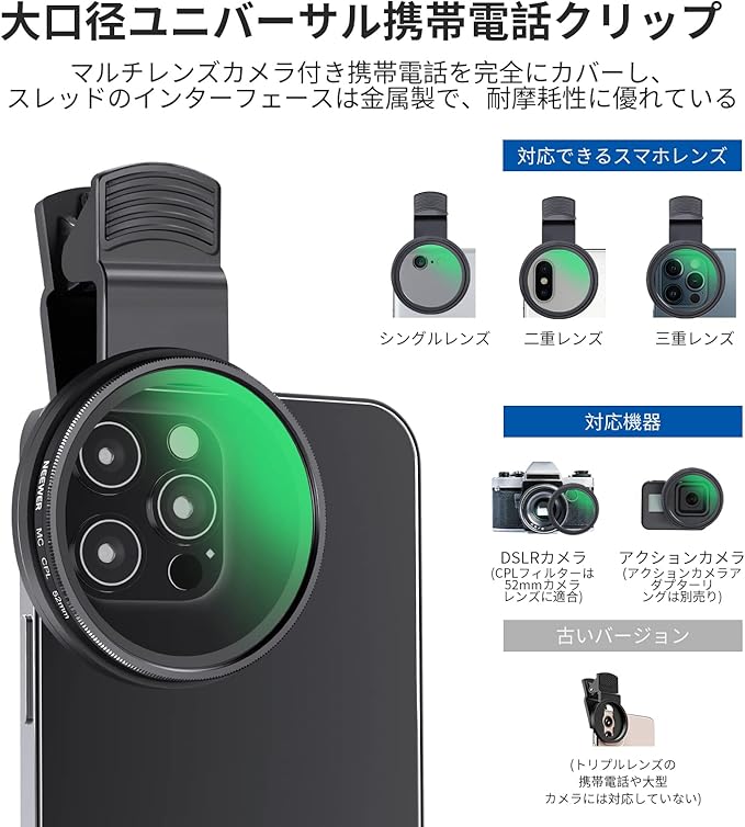 【スマホ&カメラ用CPLフィルター】クリップオン式52mm円偏光フィルターキットは、ほとんどのスマホと52mmフィルタースレッドを持つすべてのデジタルカメラレンズのために設計されています。汎用なスマホクランプはコンパチブル iPhone 16 Pro Max/16e/15 Pro Max/14 Plus/13 Mini/12/11/Galaxy S25 Ultra/S24/S22 Ultraや他のモデル。コンテンツクリエイターやインフルエンサーにとって必要な撮影アクセサリーとして最適です。
