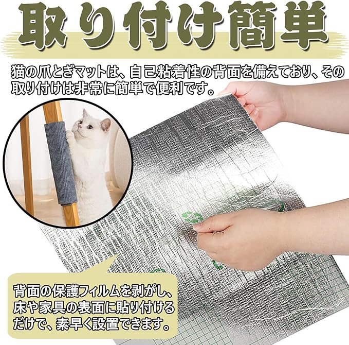 【簡単インストール】猫の爪とぎマットは、自己粘着性の背面を備えており、その取り付けは非常に簡単で便利です。背面の保護フィルムを剥がし、床や家具の表面に貼り付けるだけで、素早く設置できます。