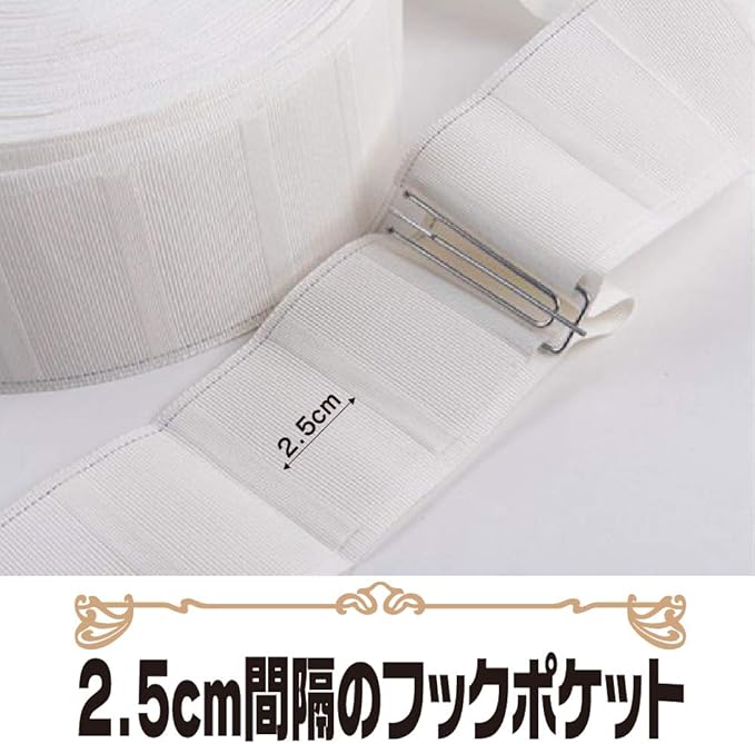 ・カーテンテープを使用するなら、カーテンにひだを作る必要なく、間隔を自由に調節しながらフックを取り付けることが可能。初心者さんでも、簡単にカーテンを作成することができます。(テープは、カーテン部分に直線縫いにて、縫い付けることができます)
