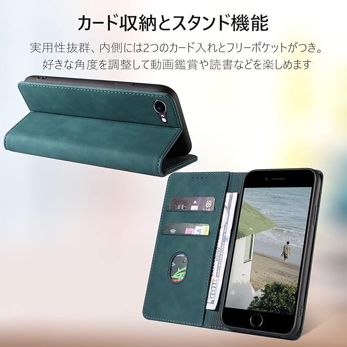 ★【実用性高いデザイン】iPhone SE2022/SE2020/8/7 のための特別設計。KWATUNGのiphonese第2世代 手帳型ケースファッションのセンスを強調、シンプルのデザインですが、高級感が溢れ。iphone se2ケースハンドアカウントタイプのデザインは正確で、ボタンの位置、充電穴、ヘッドホンジャックは支障なく使用できます。お気に入りの写真がよく見えるように特別にデザインされた透明な窓。【※ご注意:ターコイズとブルーの実際の色は、写真が示すよりも少し暗い場合があります。注意して購入してください。】