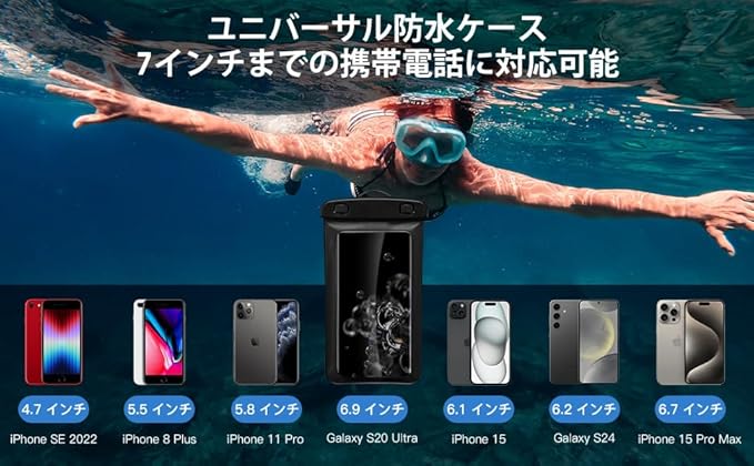 【防水ポーチ&スマホ防水ケース2個セット】防水ポーチは三重のチャックで補強された設計で、浸水を防ぎます。財布や鍵など、日常的に持ち歩く小物をポーチに収納することができます。防水スマホケースは最大6.7インチのスマホに対応しており、ネックストラップが付いており、首にかけることができ、両手を完全に解放して水遊びを楽しむことができます。自由自在に水の楽しみを味わいましょう。