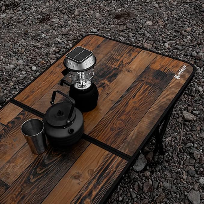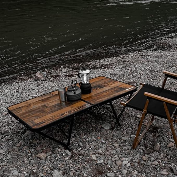 ★こちらはおしゃれなヴィンテージリアルウッド柄が目をひく柄でシックなブラックフレームを採用した2~4人用のアウトドアテーブルです。高さ68cmのハイスタイル・37cmのロースタイルの2way仕様なので、シーンに合わせて使い分けが可能。また、様々な方向から足を入れて着席できる脚の構造デザインもメリットで他にないタイプです。