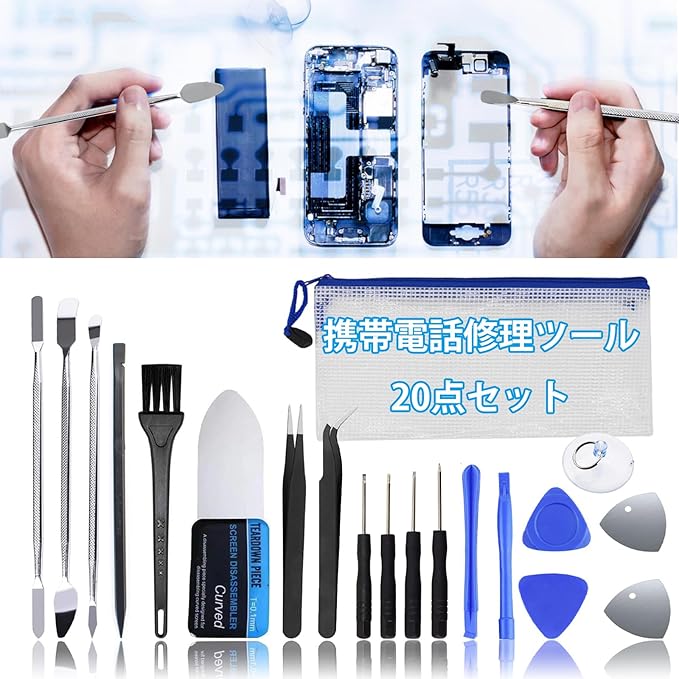 【修理工具ツール 20本組】スマートフォン、ipads、ipod touch、LCD、ノートパソコン、タブレット、スマホ画面ひび割れ補修などの修理用ツールキットです。