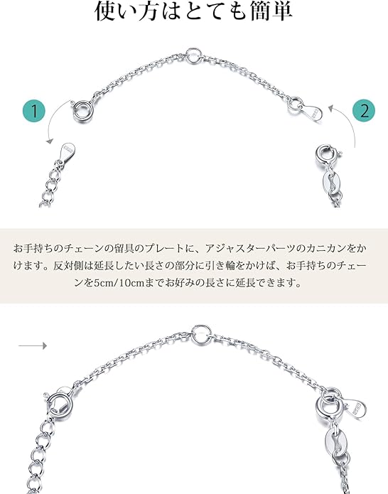 [使い方はとっても簡単] お手持ちのチェーンの留具のプレートに、アジャスターパーツの引き輪をかけます。反対側は延長したい長さの部分に引き輪をかけば、お手持ちのチェーンを5cm/10cmまでお好みの長さに延長できます。