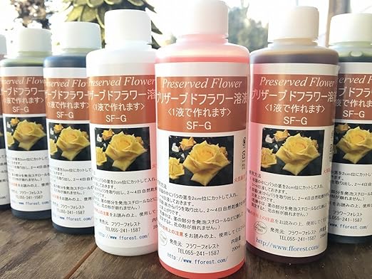本商品は1液で作る簡易加工液となります。本格プリザ加工をご希望の場合はSF-A液(脱水脱色液)とSF-B液(着色液)をご使用ください。