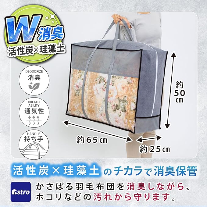 アストロ 消臭 羽毛布団収納袋 シングル ダブル兼用 活性炭と珪藻土のWパワー 消臭保管 持ち手付きで持ち運びや移動がしやすい 通気性の良い不織布製 布団収納 布団袋 収納ケース 圧縮袋 コンパクト 615-25