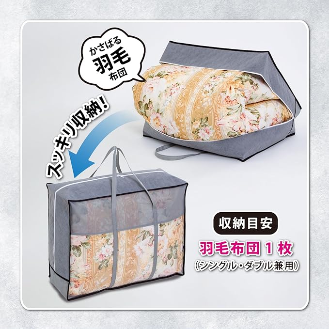 【羽毛布団をふんわりと保管】:圧縮しないので羽毛を傷めにくく、ふかふか感や暖かさを次のシーズンまでキープ。収納場所からの出し入れや持ち運びがしやすい持ち手付き。バッグ型で立てて収納できる。