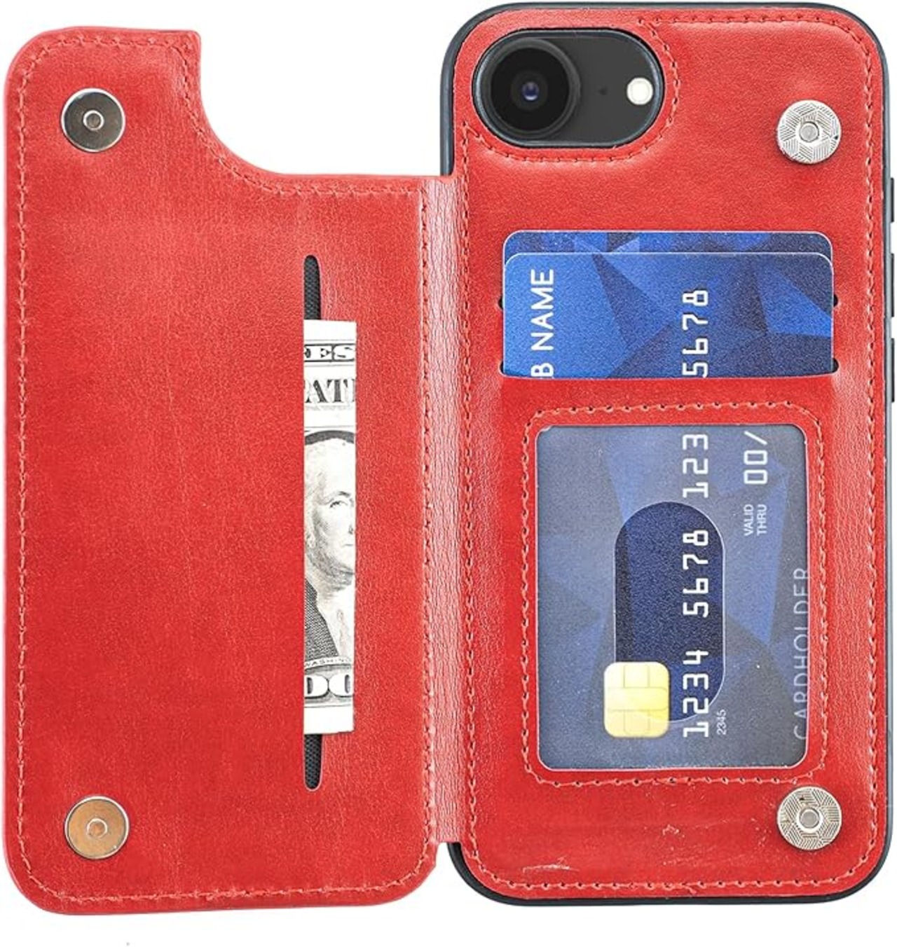 for iPhone 16E ケース スタンド機能 ICカード収納 カード収納 シンプルなレトロなファッション、防水と防汚、多機能財布収納 (赤)