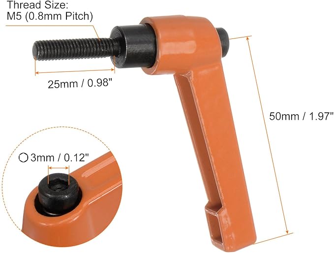 サイズ - ねじサイズ: M5 (0.8 mmピッチ); ねじの長さ: 25 mm; レバーの長さ: 50 mm; 六角ソケットのサイズ: 3 mm; カラー: オレンジ
