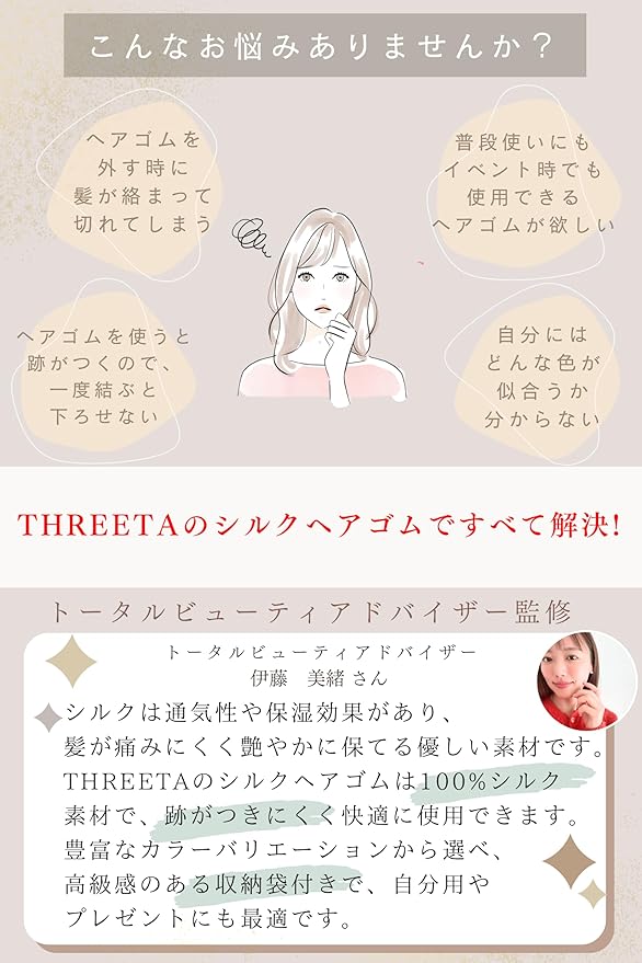 ✅【検査済みの100%高品質シルク♪】国内および国外で実施された厳格なW検査により、本物のシルク100%であることが証明されています。また、累計出荷数100,000個以上生産されている工場で品質も安心。シルクは髪と同じタンパク質成分でできており、髪の負担が少なく、髪のダメージを抑えます。さらに髪に絡みにくいので結んでいる時や外す時に痛みを感じにくく、跡がつかない等良い点がたくさん。トータルビューティーアドバイザーも絶賛しているTHREETAのシルクヘアゴムで、シルクの素晴らしさを是非実感してみてください♪