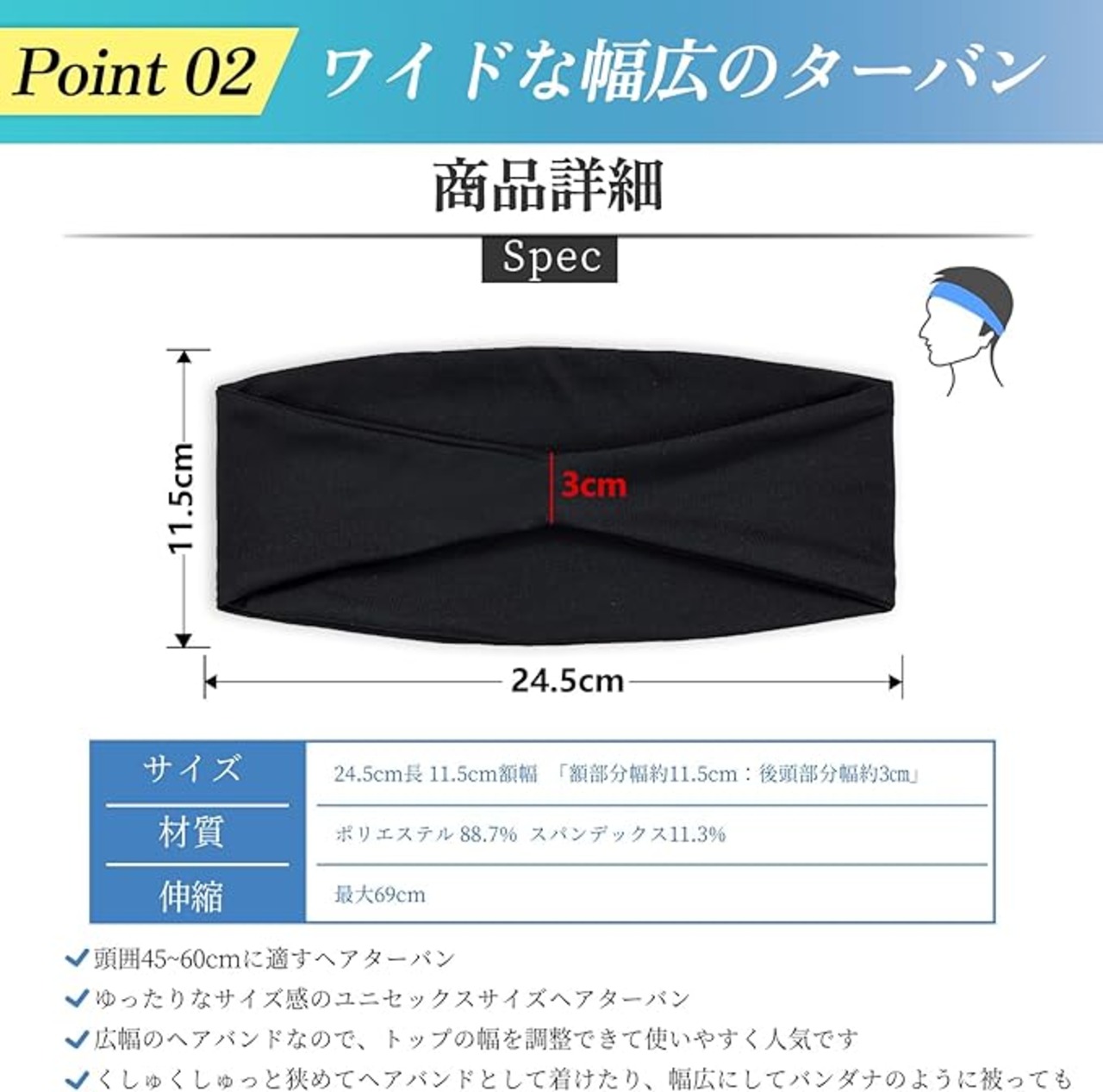 ✅【ヘアバンド仕様】材質:ポリエステル 88.7% スパンデックス11.3% ターバン約24.5cm長、約11.5cm額幅 「額部分幅約11.5cm:後頭部分幅約3㎝」 額部分の面積が広く、吸水性が抜群なヘアバンド。
