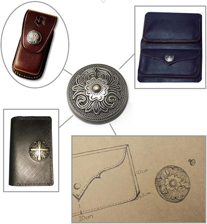 材質:合金 コンチョのサイズ:直径約20mm~33mm カラー:銀古美(ターコイズブルー) ネジのサイズ:画像にご参考ください