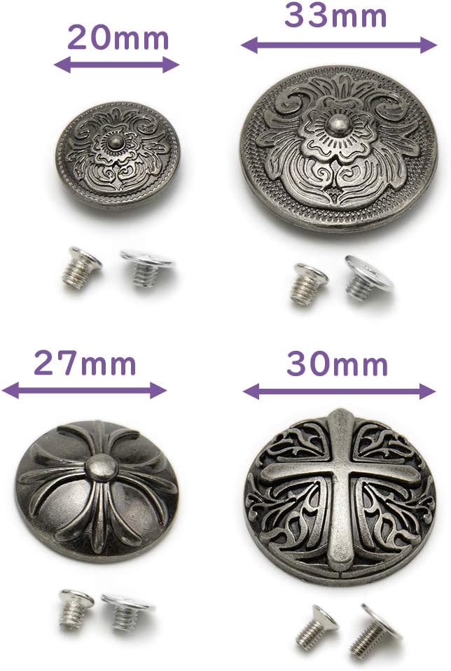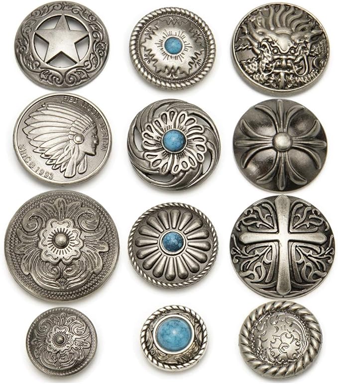 コンチョ ボタン 12個セット ねじ式 アンティーク シルバー 20mm~33mm ターコイズ 唐草 インディアン 龍 五芒星 さくら レザークラフト 財布 手芸