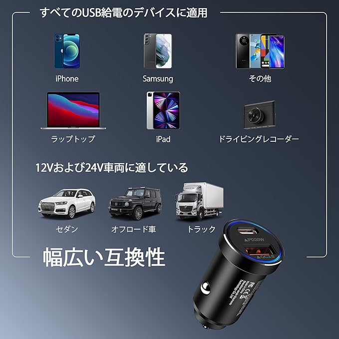 【LEDインジケーターライト付き&12V-24V車対応】:車の充電器はアルミニウム合金製で、つや消しアルミニウム仕上げで円形の青色 LED インジケータ ライトが付いているため、充電状態を確認し、暗闇での運転時に簡単に見つけることができます。車種(12V~24V)の違いにより、カーチャージャーとシガーライターソケットが完全に平行にならない場合があります。 お手持ちのシガーライターソケットの深さをご確認の上ご購入ください。