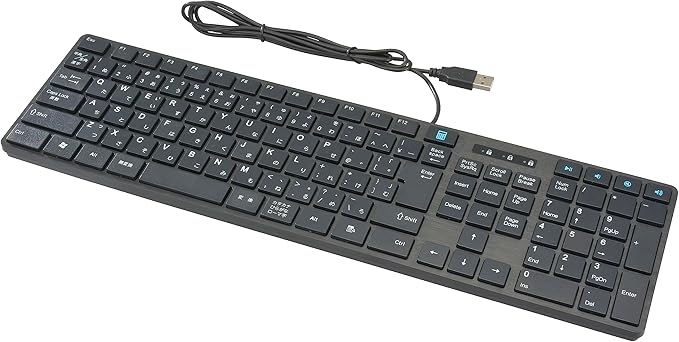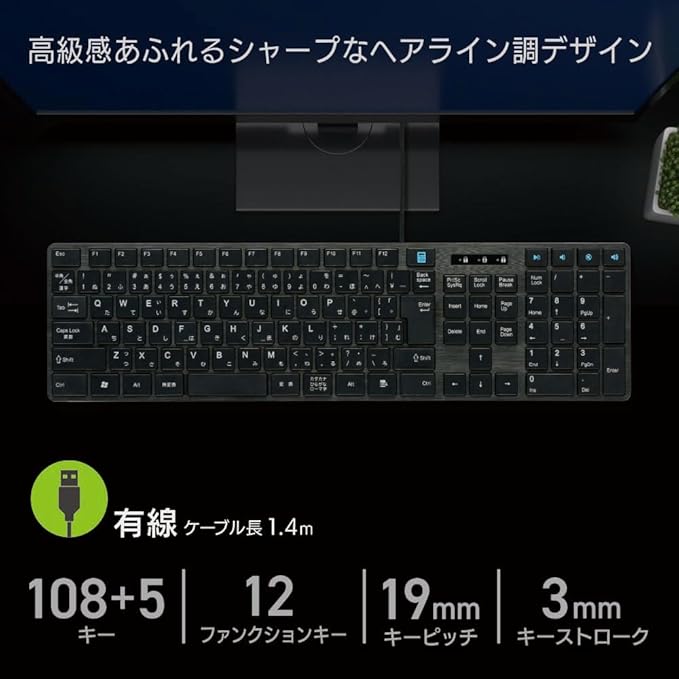 ●高級感あふれるシャープなヘアライン調デザイン ●キーストロークが深めで、しっかりとしたタッチ感のメンブレン方式を採用 ●日本語108キー+5ファンクションキー ●テンキー付きフルキーボードで作業効率アップ ●専用ドライバなどのインストール不要、USBポートに挿すだけでパソコン接続 ●19mmキーピッチ、3mmキーストローク ●本体カラーはブラック