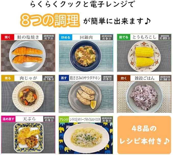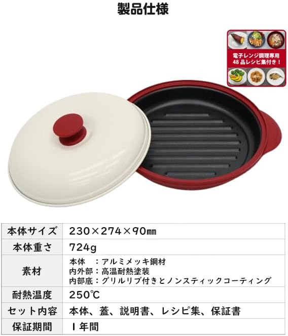 《注意事項》 ※基本的な電子レンジサイズで対応可能です。 ※お使いの電子レンジの取扱説明書を参照の上、電子レンジ庫内の手入れを行ってからご使用ください。 ※電子レンジ専用のため直火、電磁調理器(IH調理器)では使用しないでください。 ※必ず電子レンジ機能でご使用ください。オーブン機能、スチーム機能、オート調理機能でのご使用不可。