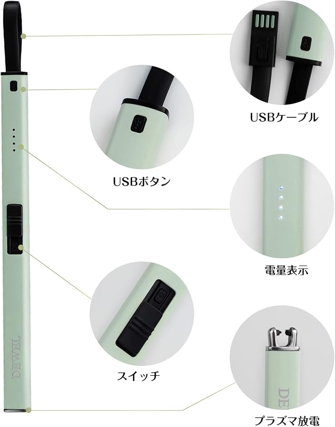 DEWEL キャンドルライター 電子ライター usb 充電式 充電ケーブル一体 プラズマライター 安全ボタン付き (グリーン)
