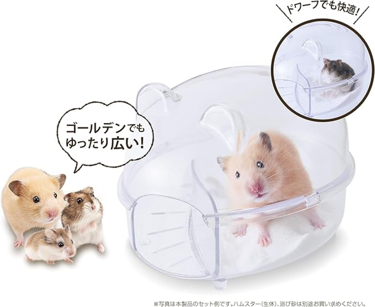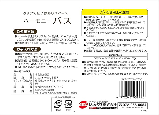 クリアで広い砂浴びスペース!セパレート構造で飛び散りを防ぐ「ハーモニーバス」 ゴールデンでもゆったり広くドワーフでも快適な砂浴びスペース。 ●バスタブとのセパレート構造で砂の飛び散りを防ぐ ●クリアで広いバスタブでかわいい姿がよく見える ●ゴールデンでも出入りラクラクな入口 ●入り口がスロープ状になっていて小さな生体でも登らずに入れる ●グラスハーモニーにもマッチするクリアでかわいい砂浴び用バスです。 <ご使用方法>●;トレーから上部クリアカバーを外し、ハムスター用バスサンド(別売)を1cmの高さを目途に入れてください。●汚れが目立ってきたら、新しいサンドに交換してください。 製品サイズ(組立時):約幅13.5 奥行16.0 高さ11.5cm