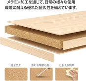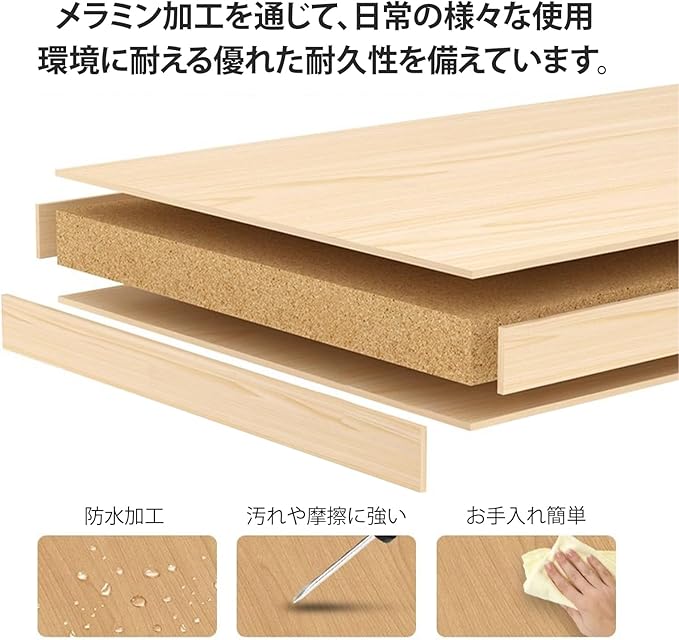 【耐久性と美しさの融合】トップボードは、メラミン加工を通じて、日常の様々な使用環境に耐える優れた耐久性を備えています。この特殊な表面処理により、スクラッチや汚れ、水分の影響から保護され、長く使用しても美しさを失わずに維持できます。その滑らかな触感は、書き物や創作活動においても理想的な条件を提供し、快適な使用体験を保証します。