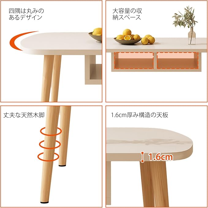 【細部へのこだわり】デザインには、細部へのこだわりが見られます。例えば、四隅の丸みは、家具の全体的な形を柔らかくし、子供やペットが近づく際にも安全を考慮しています。また、収納スペースの内部にも、整理しやすさを考慮した設計が施されています。