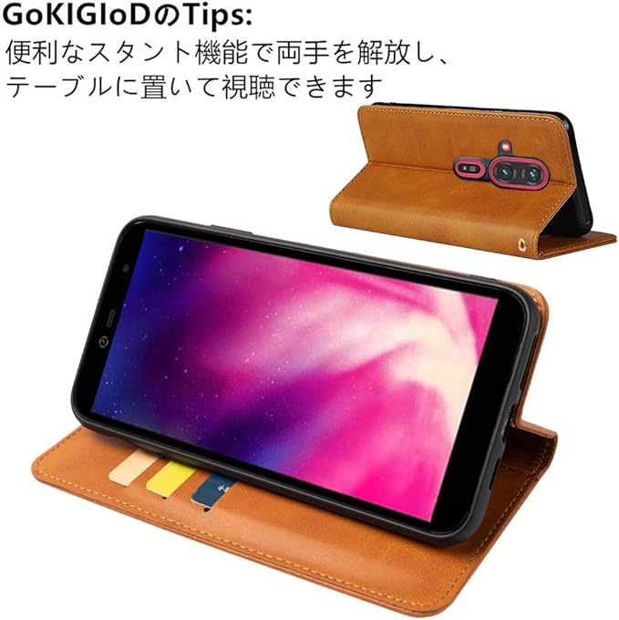 GOKIGIOD 適用 らくらくスマートフォン F-53E ケース 手帳型 PUレザー ストラップ 同梱 カード収納 スタンド機能 耐衝撃 F-53E スマホケース 手帳 らくらくスマートフォンF53E case カバー 財布型 内蔵マグネット 弱磁 ストラップホール 携帯カバー レトロ ライトブラウン