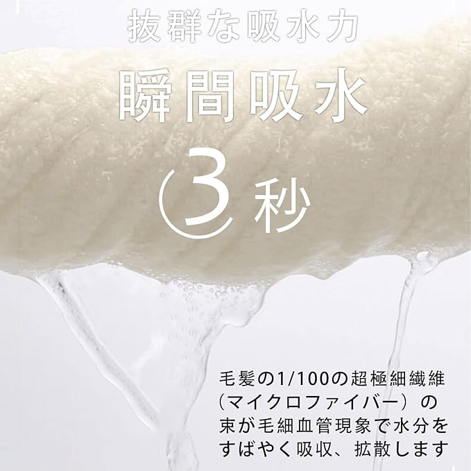 【吸水力抜群】毛髪の1/100の超極細繊維(マイクロファイバー)で、吸水力が抜群です。体はゴシゴシではなく、水分をぐんぐんに吸収。いつでもサラッとした使い心地です。