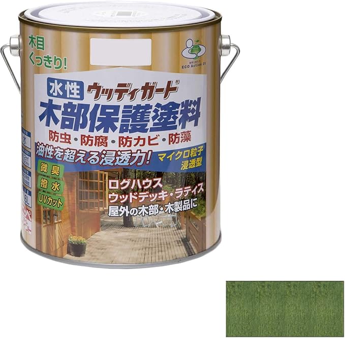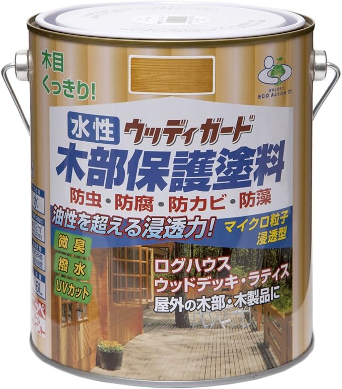 マイクロ粒子浸透型の新しい微臭の水性木部保護塗料です。 木材の防虫・防腐・防かび・防藻効果に優れ、木材に浸透して内部から木の腐食を防ぎます。 耐候性に優れたマイクロ粒子浸透型顔料の採用で、木目がよりくっきりキレイな仕上がりになります。 日光による木の焼けを防ぐために、紫外線吸収剤を配合し色アセ・劣化を防止します。(UVカット) 自然にやさしい蜜蝋成分を配合し、はっ水効果があります。