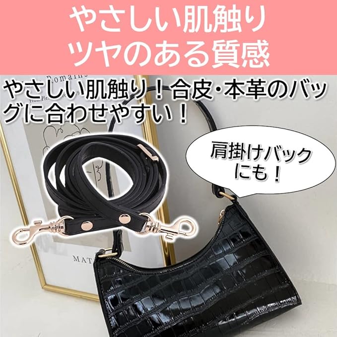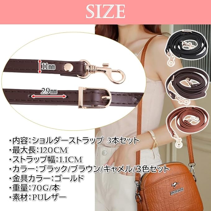 約1.1cm幅の合皮素材(PUレザー)のショルダーストラップ、3本セット。肩に掛けても重くない軽量な70gで長時間のご使用にもおすすめです。