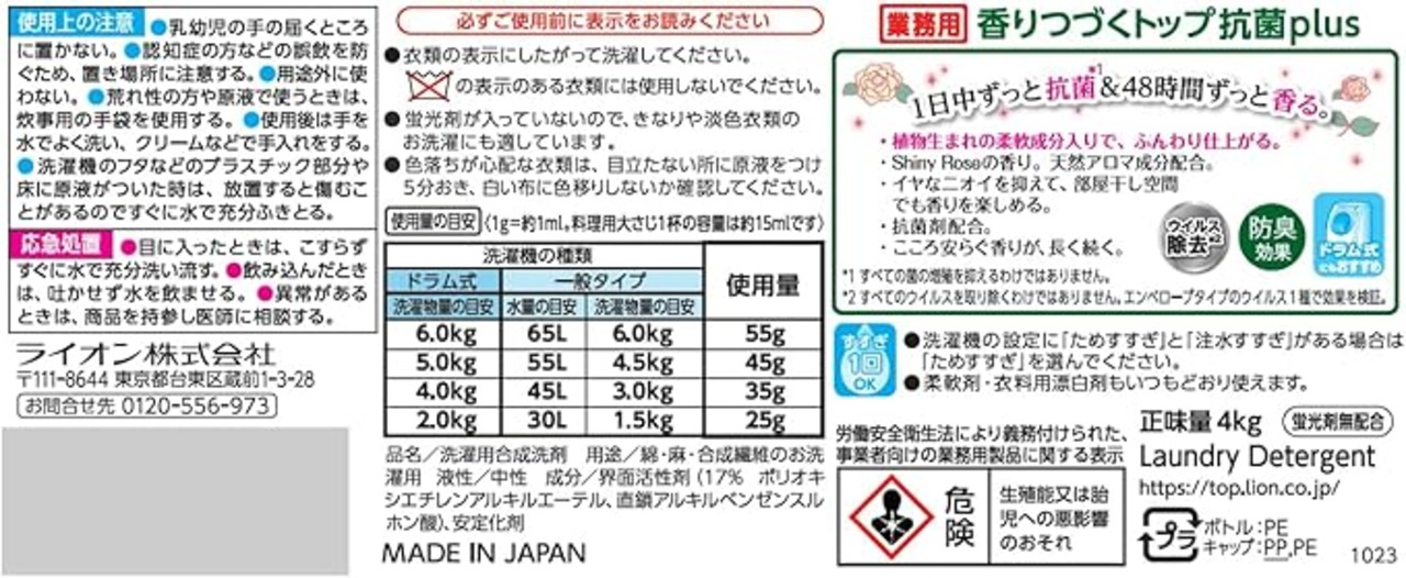 トップ 【業務用 大容量】 香りつづく 抗菌 plus 4㎏ 洗濯洗剤 詰め替え 液体 洗剤 ローズ & フローラルの香り