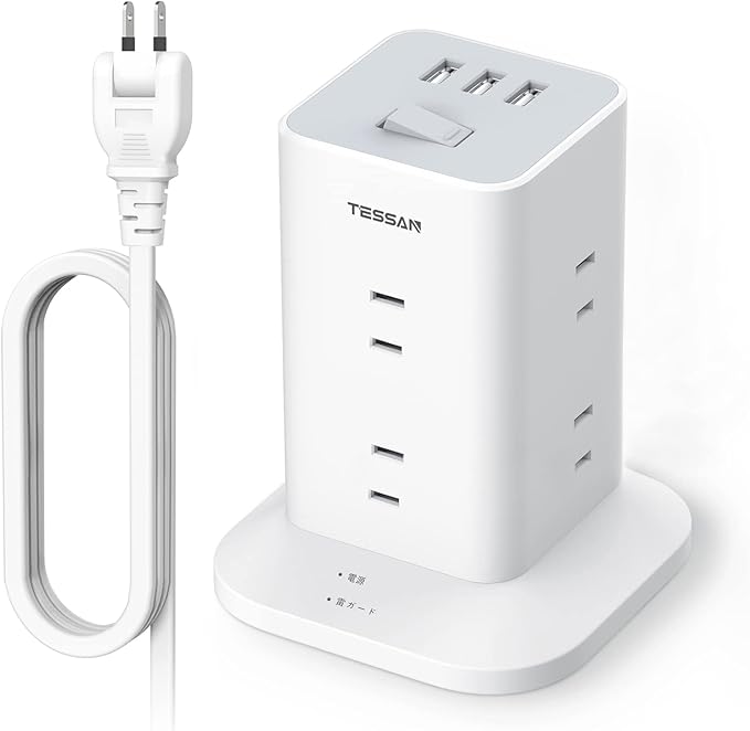 電源タップ タワー mini型 延長コード 3m usb 8個AC コンセント 3USBポート付き 180 スイングプラグ TESSAN oa 蛸足コンセント タコ足配線 マルチ テーブルタップ 雷ガード