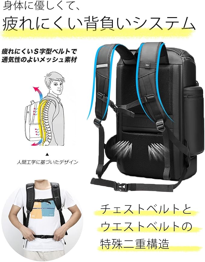 【体にやさしいバックパック】チェストベルトとヒップベルトの二重設計で、より安定してリュックを身体に固定することが出来て、より一層身体に負担をかけるのを軽減し、長時間背負っても疲れにくく、快適な背負い心地を確保します。背面には3Dメッシュ通気性マット素材を採用。通気性が良く、水分を汗などの速やかに吸収・拡散させ、快適な使用感を実現します