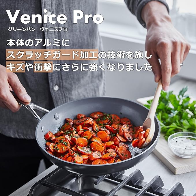 ダイヤモンド粒子が配合されたサーモロン・セラミック・コーティングに加え、スクラッチガード加工が施されたヴェニスプロシリーズ。耐久性が大幅に向上し、お料理の際には金属製のヘラなどの使用が可能になり、また食洗器のご利用も可能になりました。毎日のお料理でタフさを実感して頂けます。