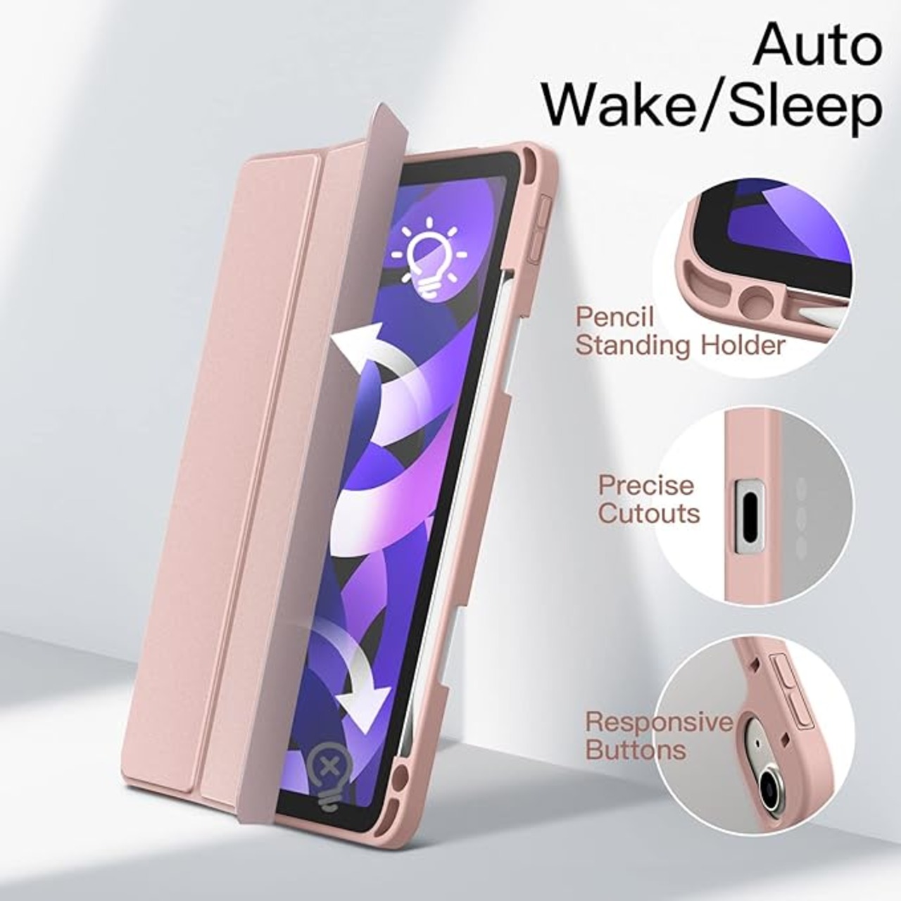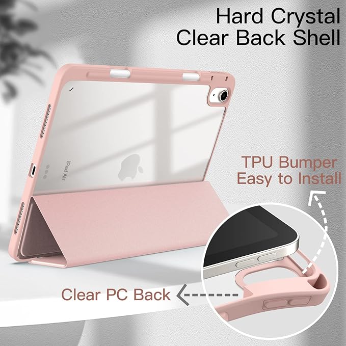 JETech iPad Air 11 インチ M3/M2 (2025/2024)、iPad Air 5/4 ケース 10.9 インチ (第5/4世代、2022/2020モデル用) Pencil収納可能透明バックカバー 薄型 スタンド 衝撃吸収 タブレットカバー オートウェイク/スリープ機能 (ローズゴールド)