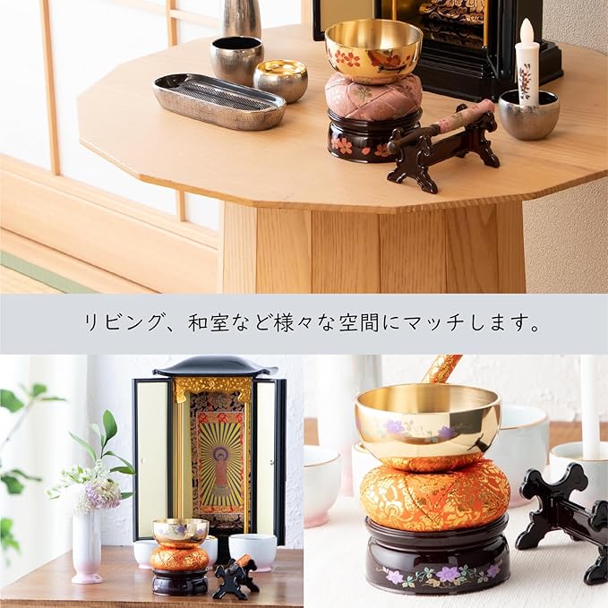仏間のない家でも、リビングやマンション暮らしの方も、さりげなく置くことができます。仏壇用品を揃え始めた方にもちょうどいい、日本製のおりんセットです。