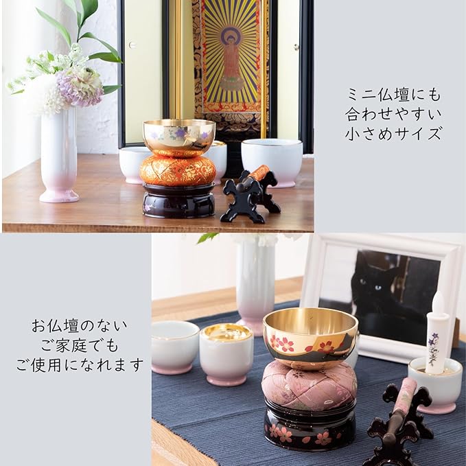 サンメニー おりん セット 本格 お手軽 2.5寸 日本製 りん 仏壇りん 現代 仏具 小さい 可愛い 桜 ピンク 毎日のお供え お参りに 手元供養 ペット 供養 狭い スペース にも 真鍮 ブラス 製 凛 とした 音色 リラックス に りん直径7.5 高さ10cm [Sunmany]