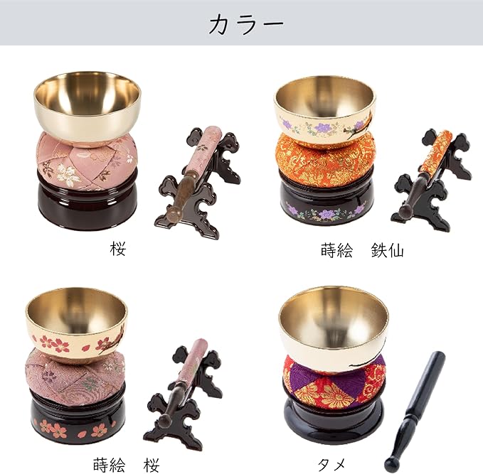 仏具の中でもメインといえるおりん。カラーバリエーションが多数あるりん台セットなので、仏壇の雰囲気やインテリアにあったおりんをお選びいただけます。