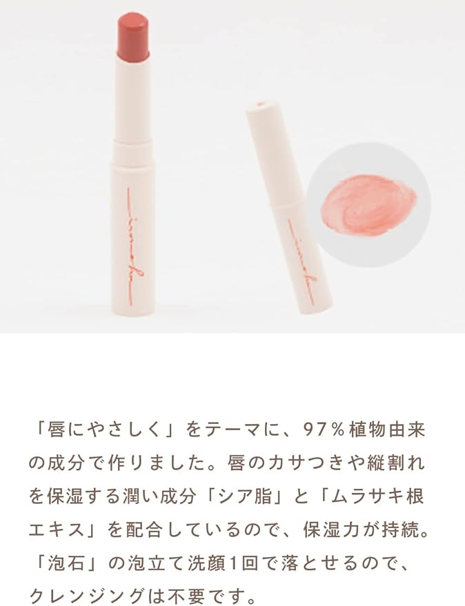 【97%植物由来の成分】「唇にやさしく」をテーマに、97%植物由来の成分で作りました。唇のカサつきや縦割れを保湿する潤い成分「シア脂」と「ムラサキ根エキス」を配合しているので、保湿力が持続。「泡石(ほうせき)」の泡立て洗顔1回で落とせるので、クレンジングは不要です。