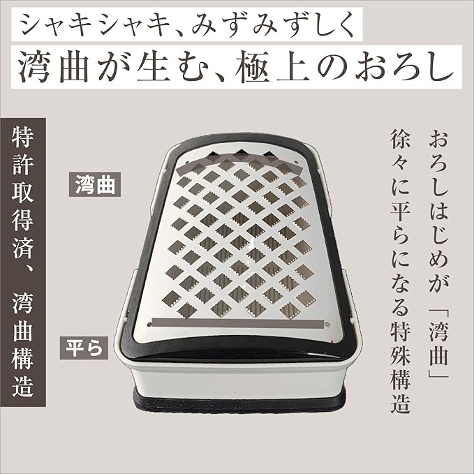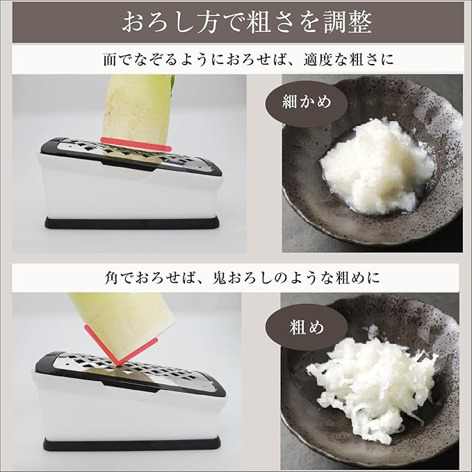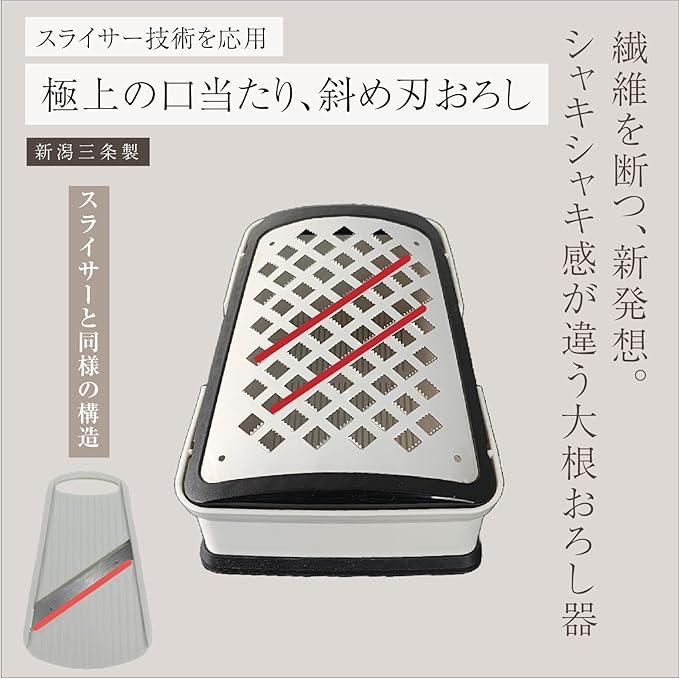 【プロの技をご家庭で再現】 四角い穴に配置した斜め刃が、繊維を細かく切断。繊維をつぶさないから、力要らずでで口当たりの良い大根おろしが 完成します。まるでプロの料理人がおろしたような、ふっくらとした食感と、大根本来の甘みを存分にお楽しみいただけます。