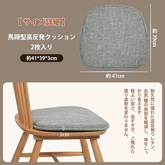 【サイズ】椅子クッション2枚入り、馬蹄型約幅41x39cm厚さ3cm、一枚重量約230gくらいです。耐久性に優れた高反発ウレタンを採用、体をしっかり支える椅子クッション.座布団です