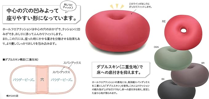 【床座りがもっとラクになる、厚みたっぷりドーナツ形】中央ホール構造が体圧を分散し、尾てい骨への負担を軽減。長時間のあぐら座りや正座も快適です。