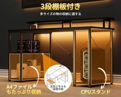 【両側ラック設計で、収納力満載】テーブルは合計3枚の棚板があり、多サイズの物の収納に適する。片側は棚板が2段あり、上段の棚板は左右どちらも設置可能で、下段の棚板はA4ファイルが収納できる。反対側はPCスタンドとしてご利用いただける。足下の空間も十分(幅78cm)で、肘掛け付きイスも問題なくスッキリ収納できる。