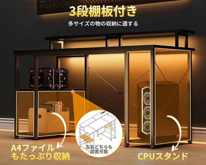 AODK ゲーミングデスク パソコンデスク コンセント&LED付き 机 pcデスク 幅120cm 両側ラック&モニター台付き 勉強机 ゲームデスク computer desk ワークデスク オフィスデスク 長机 左右入れ替え対応 ブラック