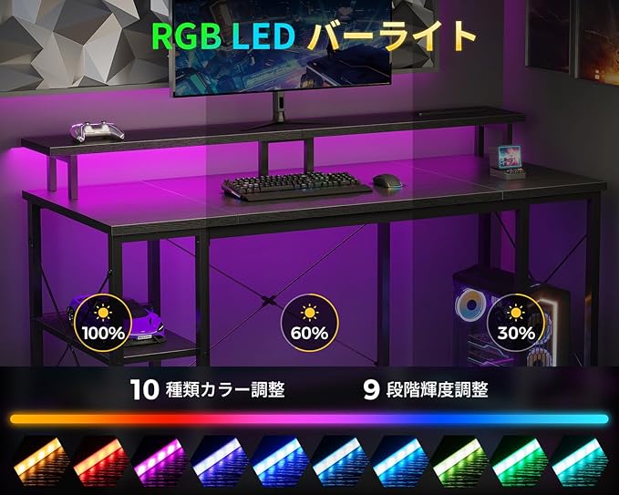 【RGBバーライト付き、お部屋の雰囲気が変わる】ゲーム机には10段階調色・9段階調光のLEDバーライトを搭載しており、気分やシーンに合わせてカラーを切り替えることができる。頑丈で長持ちやすい。臨場感にあふれるゲーム雰囲気だけではなく、温かみのある学習・仕事環境も作り出せる。